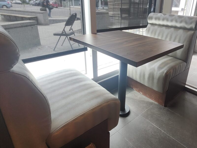 Dining tables, bar counters, and the cashier station were all crafted in-house, each piece tailored to fit the unique layout of the space. Materials were selected not only for their clean look, but also for their strength and long-term performance.